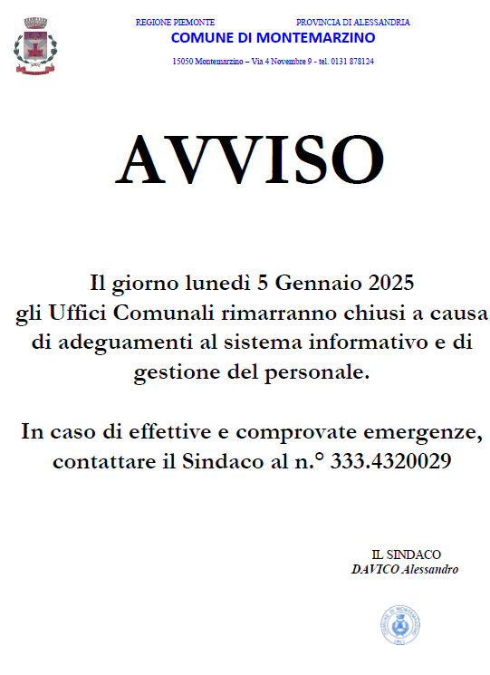Si comunica che gli Uffici Comunali rimarranno chiusi il giorno lunedì 05.01.2026 per motivi legati alla gestione del personale ed all'aggiornamento delle procedure informatiche.